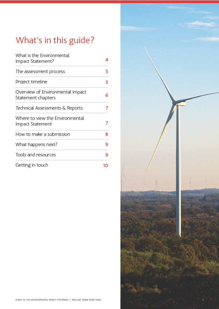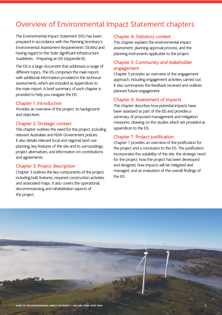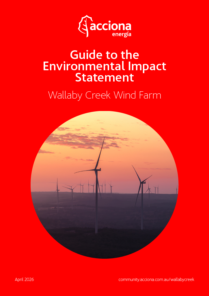 At ACCIONA Energía, we value your feedback and involvement in the design and development of our proposed Wallaby Creek Wind Farm project. We realise that the planning and assessment process can be challenging to understand. With this in mind, we have prepared a Guide to the EIS to help you navigate the EIS and to assist you in finding information and contributing during the public exhibition period. The Guide to the EIS can be found here on our webpage in the Environmental Impact Statement (EIS) section. If you would like a printed copy mailed to you, please get in touch with our team, and they will be happy to help. We hope you find the document useful, and we look forward to receiving your feedback.